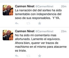 En concreto, de Carmen Ninet, diputada del PSOE en las Cortes Valencianas. La socialista publicó durante el sorteo el siguiente ‘tweet’, quejándose de la elección de conductora por parte de la pública.