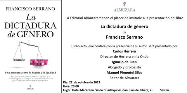 Serrano presentó ayer en Sevilla, acompañado por el periodista Carlos Herrera, su nuevo libro La dictadura de género. Una amenaza contra la Justicia y la Igualdad (Almuzara). En la presentación intervinieron el ex ministro Manuel Pimentel, como presidente del Grupo Almuzara, y el abogado Ignacio de Juan Morón.